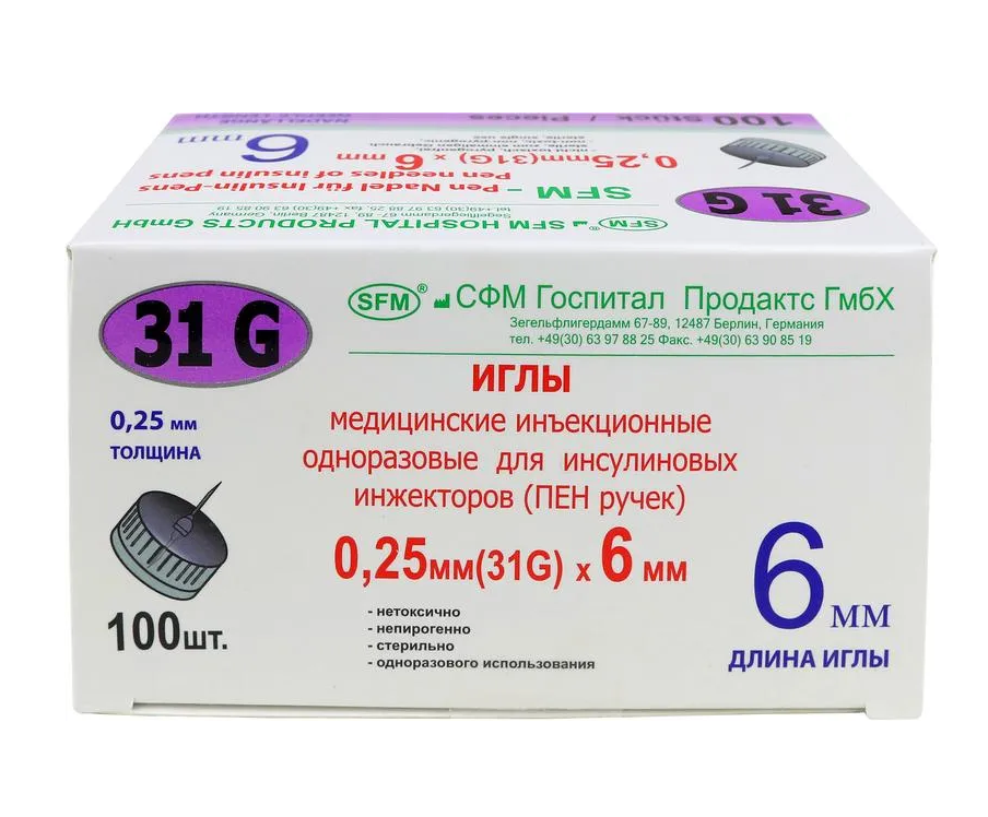 Иглы медицинские инъекционные одноразовые для инсулиновых инжекторов (ПЕН ручек) 31G (0,25ммх6мм) SFM №100