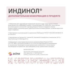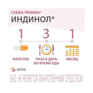 Взрослым по 1 капсуле 3 раза в день во время еды. Продолжительность приема – 1 месяц. При необходимости прием можно повторить. Не рекомендуется сочетать БАД Индинол с лекарственными средствами, понижающими кислотность желудка.