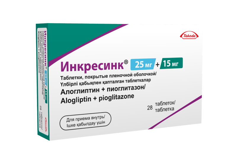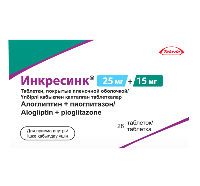 Препарат Инкресинк® представляет собой комбинацию двух гипогликемических средств с взаимодополняющими и разными механизмами действия, предназначенную для улучшения контроля гликемии у пациентов с СД2: алоглиптина, ингибитора фермента дипептидилпептидазы-4 (ДПП-4) и пиоглитазона, представителя класса тиазолидиндионов. Результаты исследований на животных при лечении диабета указывали на то, что комбинированное применение алоглиптина и пиоглитазона продуцировало аддитивное и синергическое улучшение гликемического контроля, увеличение содержания панкреатического инсулина и нормализованное распределение бета-клеток поджелудочной железы.