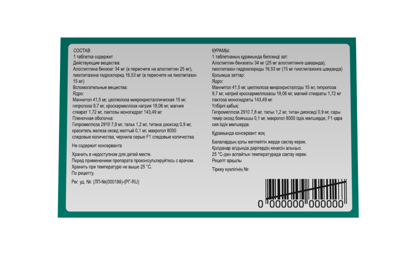 Каждая таблетка, покрытая оболочкой, содержит алоглиптина бензоат и пиоглитазона гидрохлорид в количествах, эквивалентных 25 мг алоглиптина и 15 мг пиоглитазона.