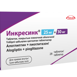 Препарат Инкресинк® представляет собой комбинацию двух гипогликемических средств с взаимодополняющими и разными механизмами действия, предназначенную для улучшения контроля гликемии у пациентов с СД2: алоглиптина, ингибитора фермента дипептидилпептидазы-4 (ДПП-4) и пиоглитазона, представителя класса тиазолидиндионов. Результаты исследований на животных при лечении диабета указывали на то, что комбинированное применение алоглиптина и пиоглитазона продуцировало аддитивное и синергическое улучшение гликемического контроля, увеличение содержания панкреатического инсулина и нормализованное распределение бета-клеток поджелудочной железы.