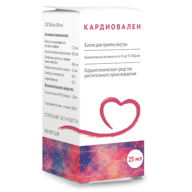 Активных компонентов Желтушника раскидистого экстракта жидкого — 17,2 мл Адонизида концентрированного — 30,3 мл Валерианы корневищ с корнями свежих настойки — 48,6 мл Боярышника экстракта жидкого — 2,2 мл Камфоры синтетической — 0,4 г Натрия бромида — 2,0 г