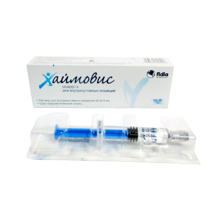 «Раствор для внутрисуставного введения 24мг/3 мл Хаймовис» (далее по тексту Хаймовис) — применяется для внутрисуставного введения при лечении остеоартрозов и улучшения подвижности сустава.