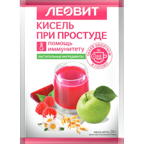Кисель "При простуде" ЛЕОВИТ - специализированный пищевой продукт диетического профилактического питания при сезонных простудных заболеваниях. Высокое содержание витамина С, а также фрукты и ягоды (черная смородина, яблоко, малина), девясил, солодка, ромашка, мать-и-мачеха, свекла, овес способствуют: