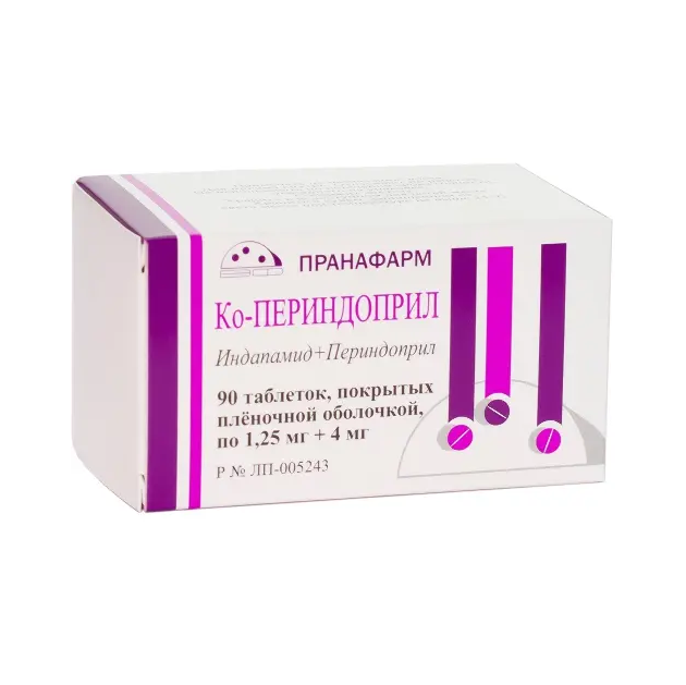 Ко-Периндоприл таблетки покрытые плёночной оболочкой 1,25мг+4,0мг №90