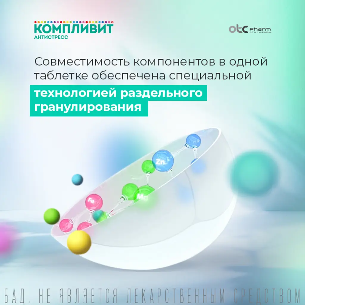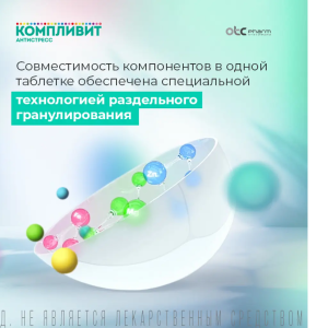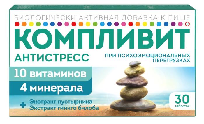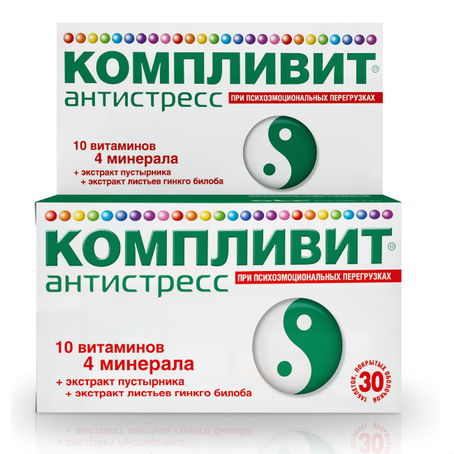 Таблетки круглой двояковыпуклой формы, покрытые оболочкой, оранжевого цвета. Научные исследования показали, что нормализация статуса питания и дотация ряда витаминов, микроэлементов в дозах, не превышающих физиологическую потребность, а также некоторых растительных компонентов очень важна при стрессе. КОМПЛИВИТ® АНТИСТРЕСС содержит экстракты пустырника и листьев гинкго билоба, а также 10 витаминов и 4 минерала, которые обеспечивают нормальную функцию нервных клеток. КОМПЛИВИТ® АНТИСТРЕСС повышает устойчивость нервной системы к психоэмоциональному перенапряжению и стрессу, оказывая адаптогенное действие. Совместимость компонентов в одной таблетке обеспечена специальной технологией.