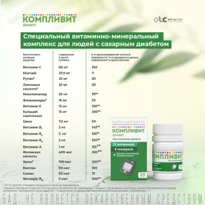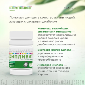 КОМПЛИВИТ® ДИАБЕТ рекомендуется в качестве биологически активной добавки к пище для больных сахарным диабетом – дополнительного источника витаминов А, С, Е, группы В (В1, В2, В6, В12, кальция пантотената, фолиевой кислоты, никотинамида), рутина, липоевой кислоты, биотина, минеральных элементов (селена, цинка, хрома), источника флавоноидов гинкго билоба.