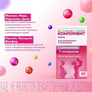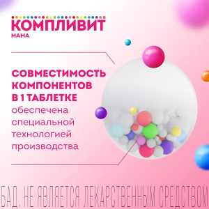 БАД «Компливит® «Мама» для беременных и кормящих» представляет собой комплекс витаминов и минералов, предназначенный для снижения риска гиповитаминоза и дефицита минеральных веществ во время беременности и грудного вскармливания.