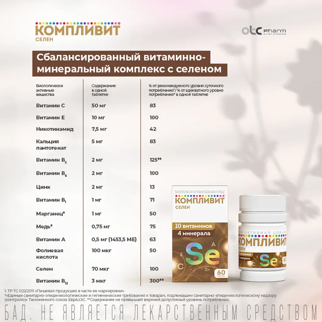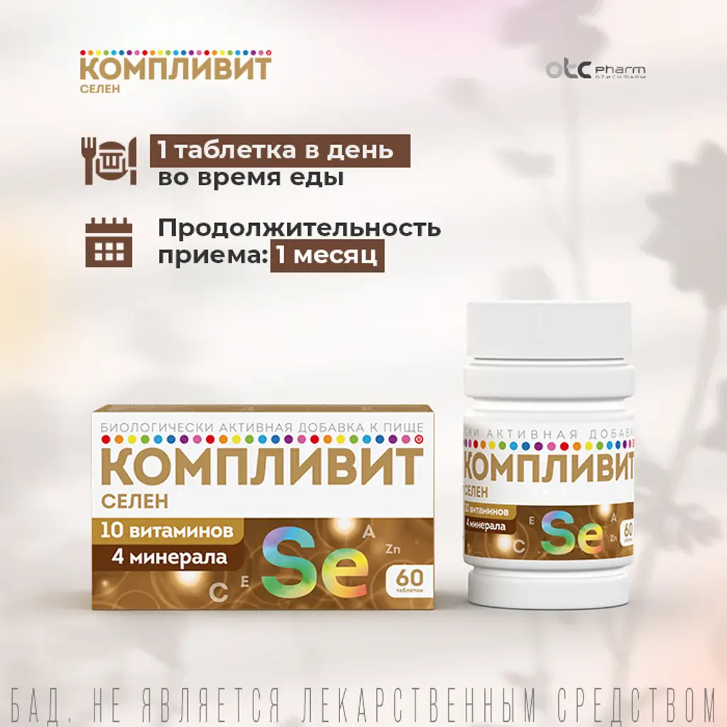 КОМПЛИВИТ® СЕЛЕН является дополнительным источником витаминов, минеральных веществ и селена. Действие КОМПЛИВИТ® СЕЛЕН обусловлено свойствами входящих в состав компонентов. Совместимость компонентов, входящих в состав КОМПЛИВИТ® СЕЛЕН , обеспечена специальной технологией. Отличительной особенностью КОМПЛИВИТ® СЕЛЕН является содержание суточной физиологической дозы селена.