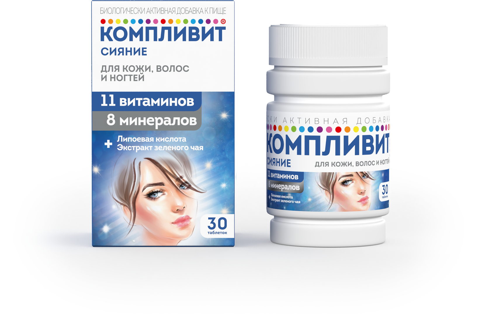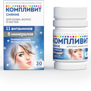 КОМПЛИВИТ® СИЯНИЕ рекомендуется в качестве биологически активной добавки к пище - дополнительного источника витаминов А, С, Е, группы В (В1, В2, В6, В12, фолиевой кислоты, биотина, кальция пантотената, никотинамида), минеральных элементов (меди, селена, кремния, железа, кобальта), липоевой кислоты и катехинов, содержащей кальций и цинк. Оказывает общеукрепляющее действие, способствует улучшению состояния кожи, волос и ногтей.