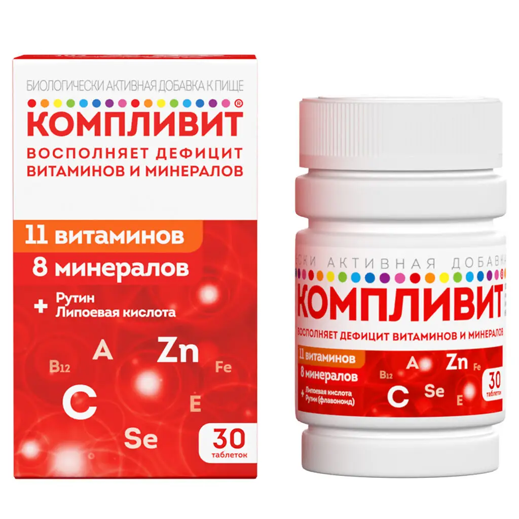 Биологически активная добавка к пище «Компливит®» является дополнительным источником витаминов А, Е, С, группы В (В1, В2, В3, В5, В6, В12, фолиевой кислоты, биотина), минеральных элементов (железа, марганца, меди, цинка, магния, селена), источником рутина и липоевой кислоты.
