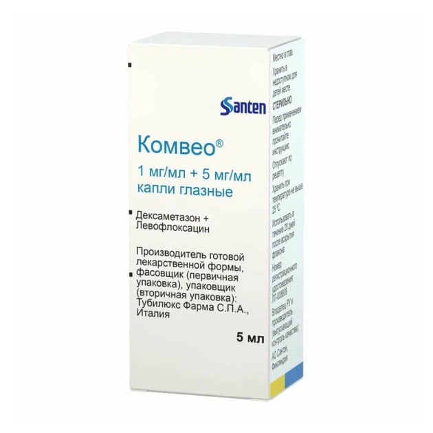 Сто двадцать пять пациентов, перенёсших хирургическую операцию по удалению катаракты, были рандомизированы на 3 группы: левофлоксацин, дексаметазон и препарат Комвео®. Одна капля каждого препарата вводилась за 60 и 90 минут до лимбального парацентеза роговицы. Среднее значение полученных концентраций левофлоксацина составило 711,899 нг/мл (95% ДИ: 595,538 828,260) в группе препарата Комвео® по сравнению с 777,307 нг/мл (95% ДИ: 617,220 937,394) при введении левофлоксацина отдельно. Концентрации левофлоксацина в водянистой влаге глаза значительно превышают минимальные подавляющие концентрации для патогенных микроорганизмов, входящих в спектр действия левофлоксацина.