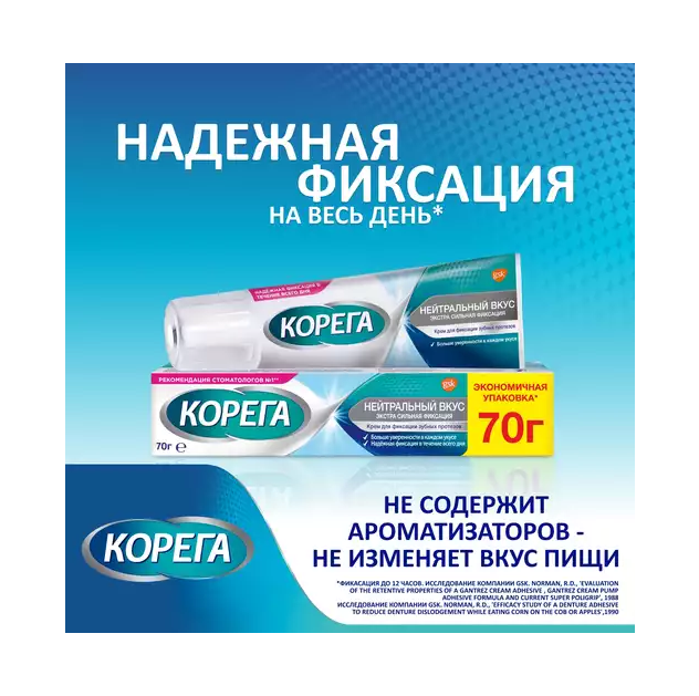 Крем для фиксации зубных протезов Корега Нейтральный вкус разработан для всесторонней фиксации и не содержит искусственных ароматизаторов или красителей и поэтому не влияет на вкус пищи.