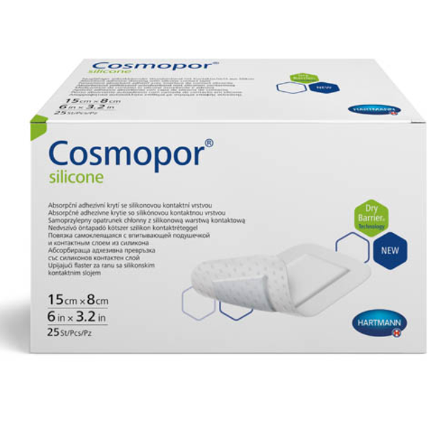 Повязка впитывающая пластырного типа с контактным слоем из силикона Cosmopor® silicone/Кocмonop силикон. Cosmopor® silicone/Кocмoпop силикон представляет собой неактивную одноразовую самоклеящуюся стерильную и полупроницаемую повязку на рану (гидроцеллюлярную тонкую повязку), состоящую из нетканого материала основы (материала-носителя) и впитывающей подушечки для раны. Обе части повязки покрыты силиконовым клеевым перфорированным слоем и защищены пленкой.