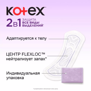 Ежедневные прокладки Kotex 2в1 созданы специально для тех моментов, когда вам необходима дополнительная защита! Kotex 2в1 обеспечивает защиту от всех видов выделений - ежедневных и при недержания мочи. Специальный центр FlexLocTM содержит суперабсорбент, который надежно удерживает влагу внутри и нейтрализует запах урины, даря ощущение свежести и уверенности на весь день. Тонкая, длинная и гибкая, ежедневная прокладка надежно держится на белье и адаптируется под анатомию тела, обеспечивая чувство комфорта и легкости. Несмотря на свою тонкость, благодаря усиленному абсорбирующему слою она впитывает не меньшее количество жидкости, чем более толстые ежедневки, представленные на рынке. Не содержит ароматизаторы. Каждая прокладка упакована в индивидуальную упаковку, который удобно брать с собой - поместится даже в самой маленькой сумочке.
