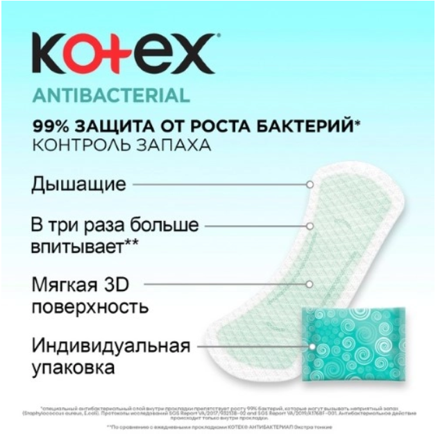 *Специальный антибактериальный слой внутри прокладки препятствует росту 99% бактерий, которые могут вызывать неприятный запах (Staphylococcus aureus, E.coli). Протоколы исследований SGS Report VA/2017/93213B-02 and SGS Report VA/2019/A1768F-001. Антибактериальное действие происходит только внутри прокладки.