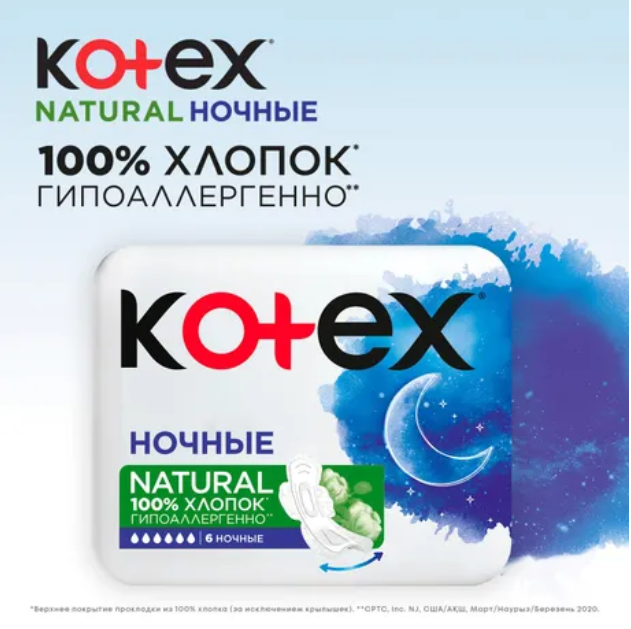 Каждой девушке нужна надёжная защита во время месячных, особенно при обильных выделениях. Прокладки Kotex® Natural НОЧНЫЕ обеспечивают спокойный сон — протеканий с ними можно не бояться. Их гибкая и удлиненная форма обеспечивает лучшее прилегание к телу и надежно защищает от протеканий. Эти ночные прокладки гипоаллергенны: разрабатывая верхний слой, мы полностью исключили красители, ароматизаторы и пластик. А улучшенная задняя поверхность прокладок позволяет коже дышать. Это означает, что изделия могут использовать девушки с самой чувствительной кожей. Дерматологические исследования это подтвердили.