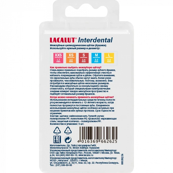 Использование интердентальных щеток Lacalut Interdental позволяет удалить зубной налет и остатки пищи из межзубных промежутков и с контактных поверхностей зубов , осуществляют массаж десен. Используются для чистки зубных брекетов и протезов.