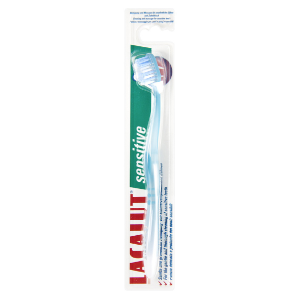 Зубная щетка Lacalut sensitive предназначена для чистки чувствительных зубов. Она имеет очень мягкие, закругленные нейлоновые щетинки и волнообразный профиль. За счет клиновидной головки щетка обеспечивает деликатное и качественное удаление налета со всей поверхности эмали, включая пришеечную зону и труднодоступные для чистки области.