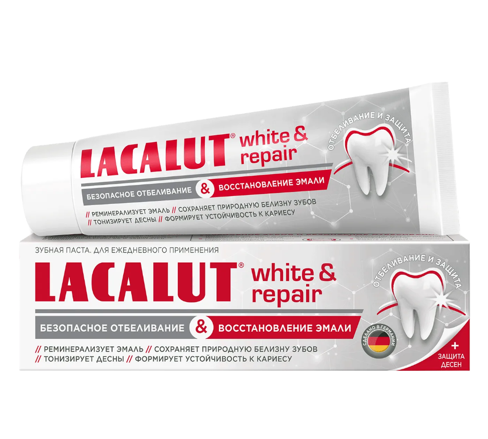 Зубная паста Lacalut white&repair создана для людей, ценящих гладкую и чистую зубную эмаль. Использование пасты позволяет осветлить зубную эмаль до природного оттенка. Пирофосфат в составе зубной пасты делает зубной налет более мягким, и он легко удаляется с поверхности эмали во время чистки. Абразивные вещества со сферической огранкой и гидроксиапатит полируют эмаль и делают ее гладкой. Фторид укрепляет эмаль и защищает от кариеса, лактат алюминия, антисептик и эфирные масла дополнительно снижают количество бактерий и освежают дыхание. Идеальна для курильщиков и любителей чая и кофе.