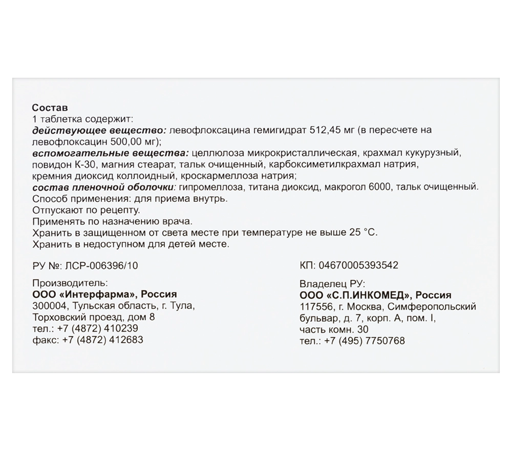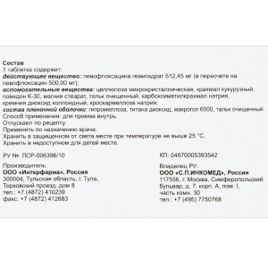 Активное вещество: левофлоксацина гемигидрата (в пересчете на левофлоксацин безводный) 250 мг или 500 мг.