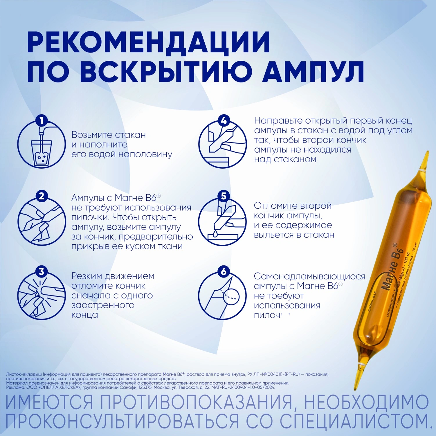 Самонадламывающиеся ампулы с Магне В6® не требуют использования пилочки. Чтобы открыть ампулу, возьмите её за кончик, предварительно покрыв её куском ткани, и отломите его резким движением сначала с одного заострённого конца, а затем с другого, предварительно направив открытый первым конец ампулы под углом в стакан с водой, таким образом, чтобы отламываемый вторым кончик ампулы не находился над стаканом. После отламывания второго кончика ампулы её содержимое свободно выльется в стакан.