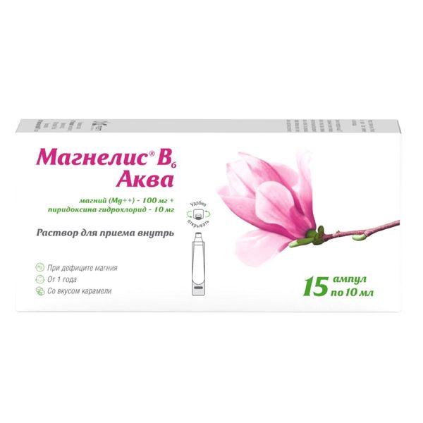 Препарат Магнелис® В6 Аква представляет собой лекарственное средство в форме раствора для приёма внутрь и является комбинацией витамина B6 с минеральными веществами. Препарат содержит действующие вещества: магния лактата дигидрат, магния пидолат, пиридоксина гидрохлорид (Витамин B6).