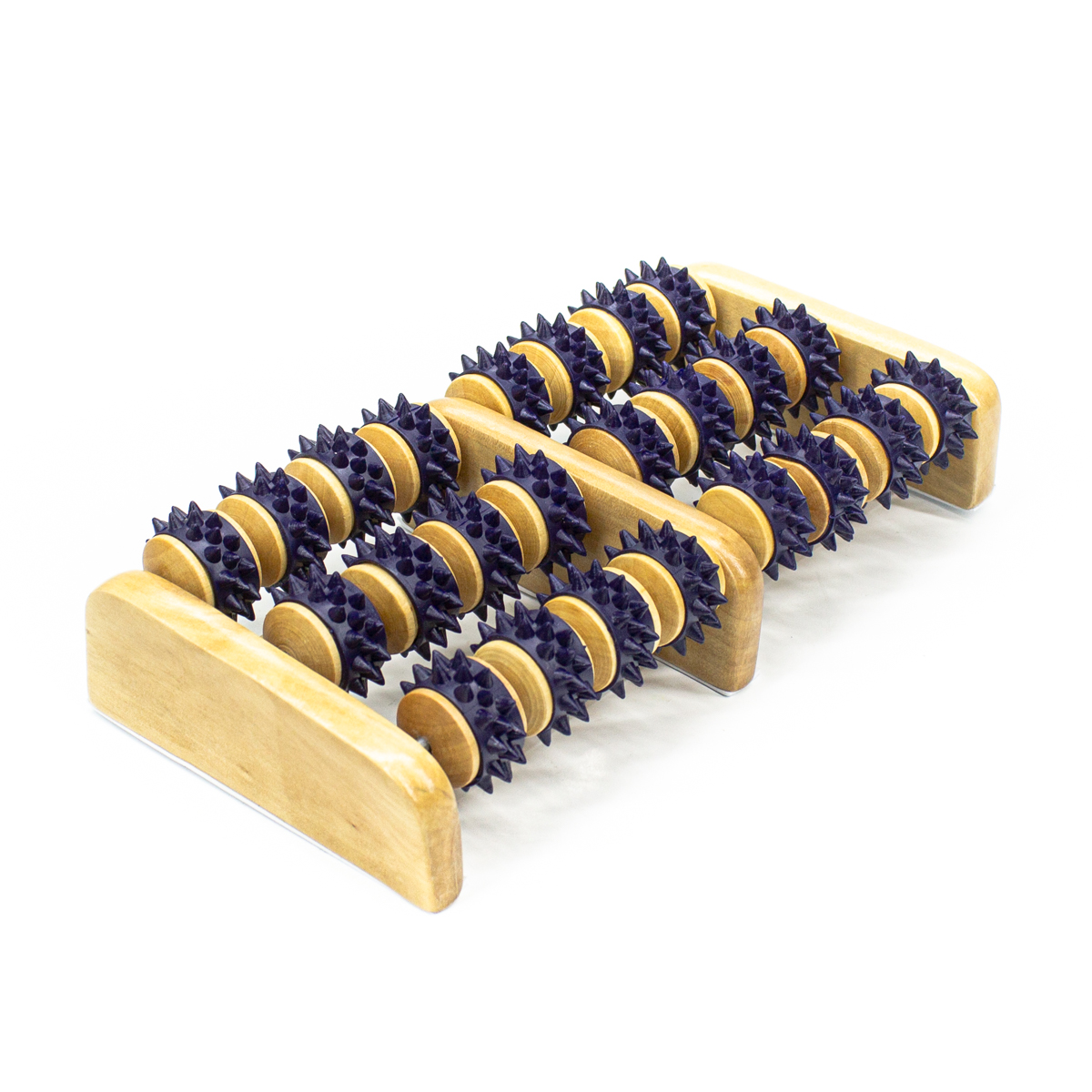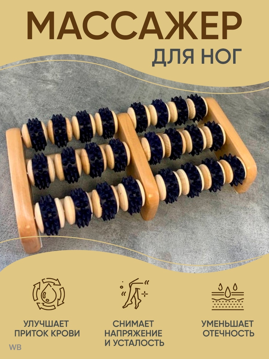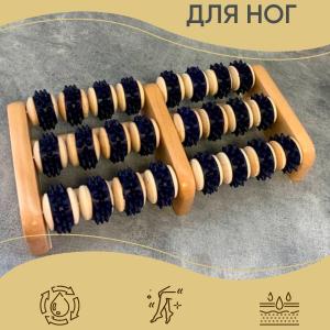 Массажер для ног выполнен из дерева, валики имеют пластиковое покрытие. Обеспечивает умеренное массажное воздействие на стопу. Предназначен для рефлексогенного воздействия на мягкие ткани тела, улучшает кровоток, проводит оздоровительную нейростимуляцию, восстанавливает обмен веществ мягких тканей тела человека в зоне воздействия. Эффективен при поверхностном и глубоком рефлексогенном воздействии на подошву стоп. Вы можете заниматься домашними делами и массировать стопы. Десяти минут вполне достаточно для улучшения самочувствия, снятия болевого синдрома и усталости. При более длительном воздействии происходит релаксация мышц стопы, улучшение кровотока и лимфодренаж.