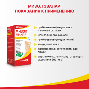 Мизол® Эвалар эффективен при лечении микозов, поражающих области кожи с гиперкератозом, а также в зонах роста волос.