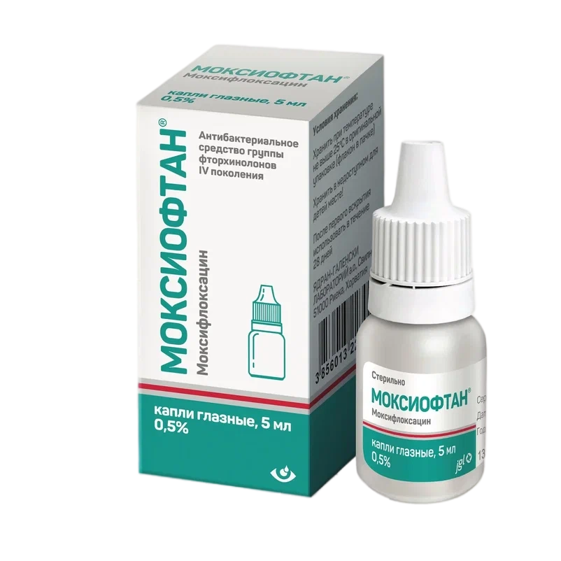 Действующее вещество: моксифлоксацина гидрохлорид 5,45 мг в пересчёте на моксифлоксацин 5 мг