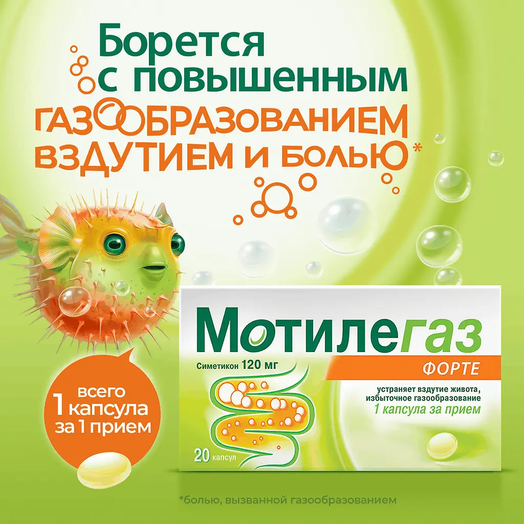 Симптоматическое лечение метеоризма (избыточного газообразования и вздутия живота), связанного с расстройствами со стороны желудочно-кишечного тракта - в том числе, вызванного функциональной диспепсией.