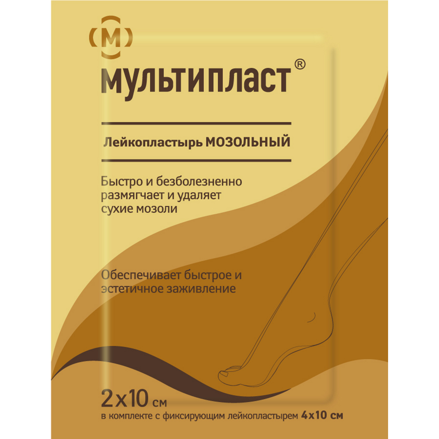 2. Лейкопластырь мозольный «Мультипласт»® размером: - 2 × 10 см в комплекте с фиксирующим лейкопластырем 4 × 10 см