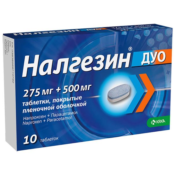 Препарат Налгезин® ;дуо показан для симптоматического лечения боли, требующей более выраженного обезболивающего эффекта, чем ;напроксен ;в дозе 275 мг или ;парацетамол ;в дозе 500 мг по отдельности.