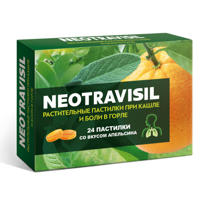 Растительное средство NEOTRAVISIL содержит инновационную комбинацию из 4 экстрактов лекарственных трав: солодки, эвкалипта, камфоры, мяты, а также экстракт плодов апельсина, которые, благодаря комплексному эффекту компонентов, обеспечивают двойное действие: помогают при кашле и боли в горле.