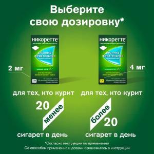 - жевательной резинкой «Никоретте® » 4 мг (повышенное содержание никотина) следует пользоваться, если Вы выкуриваете более 20 сигарет в день или Вам не удалось бросить курить при использовании жевательной резинки в дозе 2 мг.