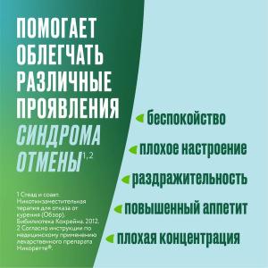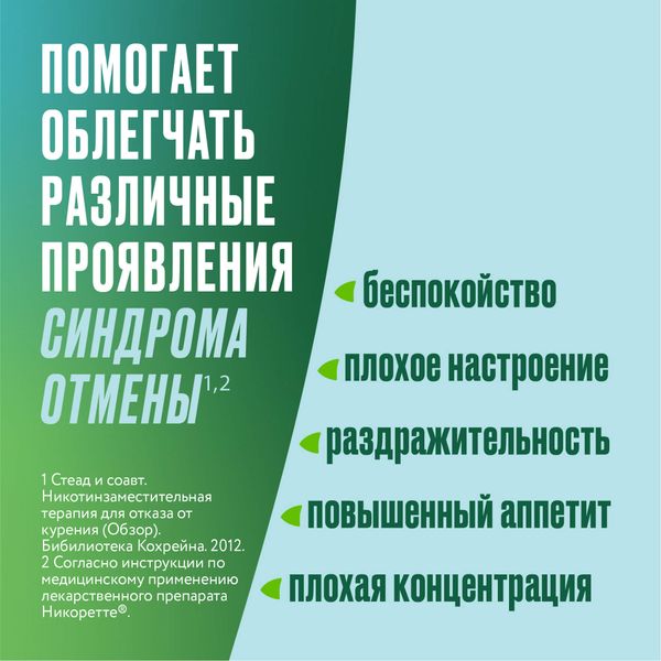 Спрей Никоретте® облегчает и (или) предотвращает тягу к курению и симптомы «отмены», возникающие при табачной зависимости.