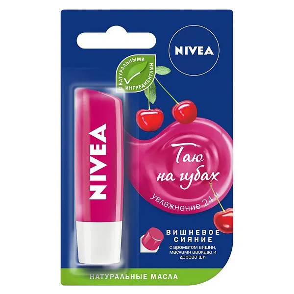 Вы хотите открыть новый великолепный аромат? Сочетание экстракта вишни и мерцающих частичек бальзама для губ NIVEA Вишневое сияние придает губам красноватый оттенок и фруктовый аромат. Специальная формула с маслами авокадо и дерева ши делает губы мягкими и нежными, увлажняя их в течение 24 часов. Ценные масла в составе бальзама широко применяются в косметических продуктах. Они быстро абсорбируются кожей, делают ее мягкой и эластичной. Кроме того, они получили высокую оценку экспертов в области ухода за кожей, благодаря высокому содержанию витаминов, питательных веществ, белков, антиоксидантов и полезных жиров.
