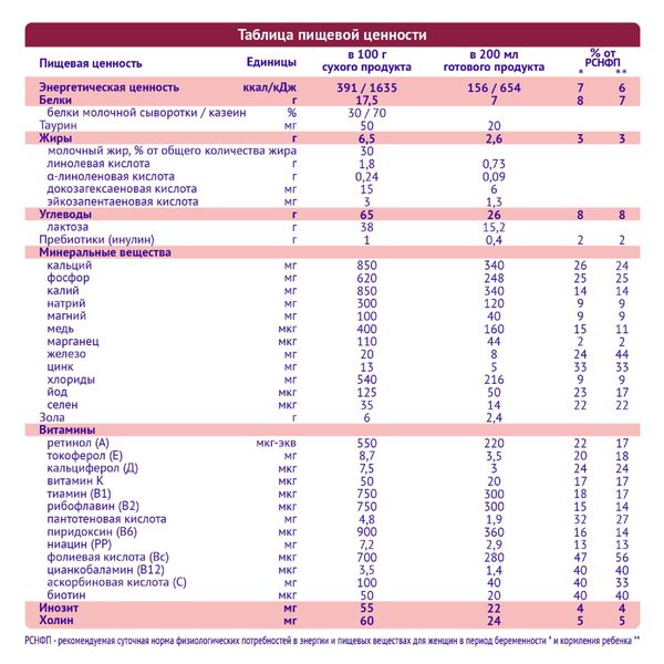 - В период подготовки и во время беременности: Обеспечивает дополнительные потребности женщины в полноценном белке, фолиевой кислоте, омега – 3 жирных кислотах, кальции, железе, витаминах группы B и других нутриентах. Положительно влияет на правильное формирование и развитие плода.