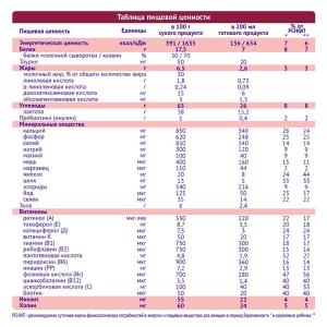 сухое обезжиренное молоко, глюкозный сироп, сухая деминерализованная молочная сыворотка, сухое цельное молоко, растительные масла (соевое, подсолнечное высокоолеиновое), инулин, минеральные вещества (фосфат кальция, хлорид магния, хлорид натрия, цитрат калия, карбонат кальция, сульфат железа, сульфат цинка, сульфат меди, хлорид марганца, йодид калия, селенит натрия), витамины (аскорбиновая кислота, токоферола ацетат, никотинамид, D-пантотенат кальция, пиридоксина гидрохлорид, рибофлавин, фолиевая кислота, тиамина гидрохлорид, ретинола ацетат, D-биотин, филлохинон, холекальциферол, цианокобаламин), рыбий жир (источник докозагексаеновой DHA и эйкозапентаеновой EPA кислот), натуральный ароматизатор, инозит, таурин, эмульгатор (соевый лецитин), антиокислитель (L-аскорбилпальмитат).