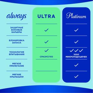 Гигиенические прокладки Always Ultra оснащены технологией нейтрализации запаха, которая блокирует неприятный запах, а не просто маскирует его. Гигиенические прокладки Always Ultra толщиной всего 3мм дарят комфорт и обеспечивают непревзойденную защиту во время менструации.