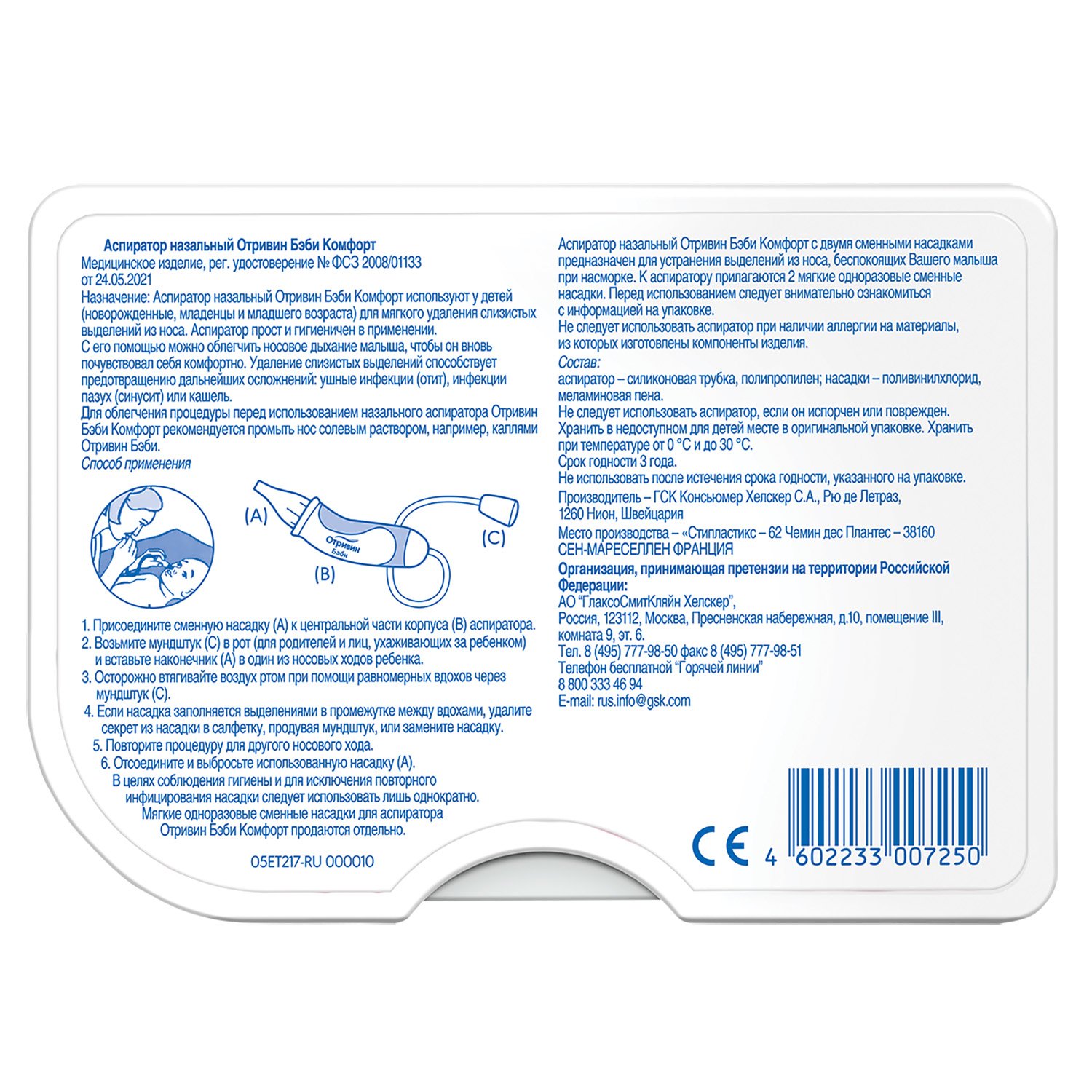 Аспиратор назальный Отривин Бэби Комфорт используют у детей (новорожденные, младенцы и младшего возраста), для мягкого удаления слизистых выделений из носа, беспокоящих вашего малыша при насморке. Аспиратор прост и гигиеничен в применении.