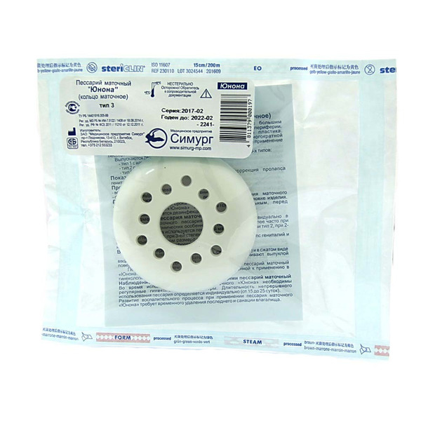 Пессарии маточные «Юнона» из инертного пластика применяются для консервативной коррекции опущения и выпадения матки. По сравнению с подобными изделиями из резины эластичный маточный пессарий «Юнона» гораздо реже вызывает воспаление и более долговечен. Пессарий имеет блюдцеобразную форму с большим центральным отверстием и многочисленными отверстиями по периферии. Гибкий, при нагревании до температуры тела приобретает оптимальную мягкость.