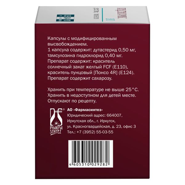 Активные вещества: Дутастерид 0.5 мг, Тамсулозин 0.4 мг.