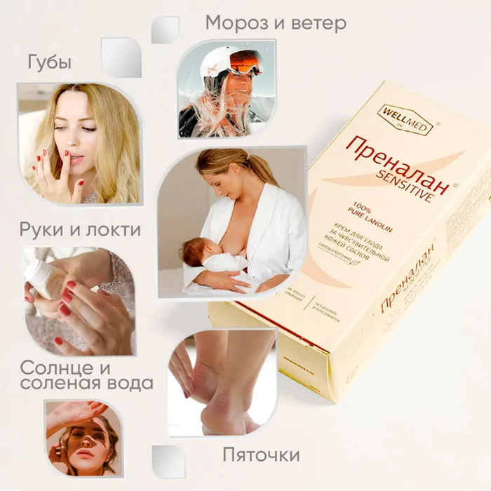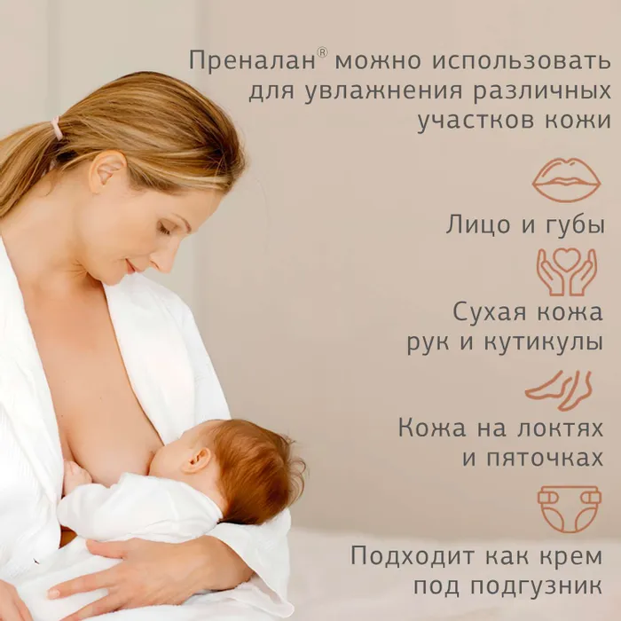 Преналан Sensitive (ланолиновый крем для сосков) ускоряет заживление трещин, полученных от внешнего воздействия на кожу и сохраняет естественную влагу кожи, образуя на ее поверхности длительный липидный барьер, который держится до 6 часов. Его не нужно смывать перед кормлением.