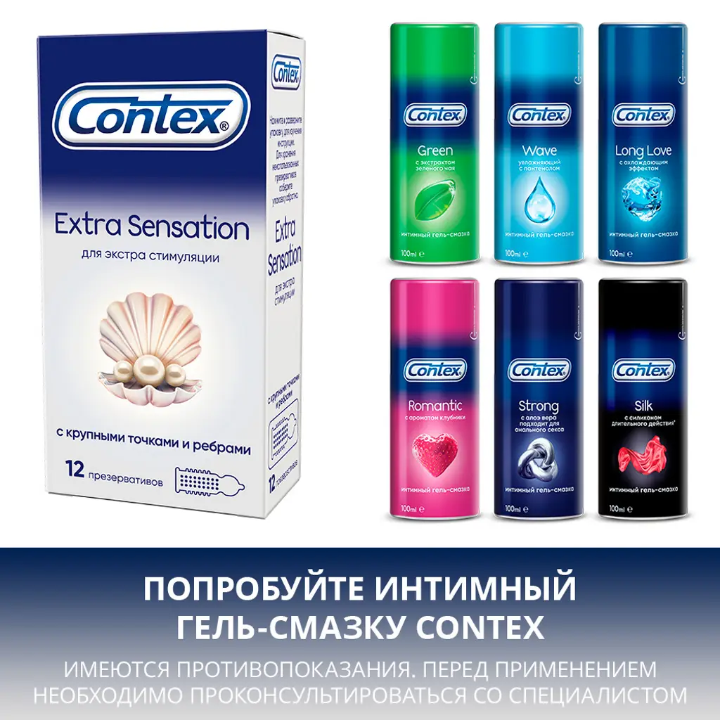 Презервативы Сontex® Extra Sensation с крупными точками и ребрами. ;Contex Extra Sensation (Экстра Сенсейшен) с более крупными точками и ребрами для экстра стимуляции. Бесцветные, анатомической формы, в силиконовой смазке, с накопителем. Номинальные размеры: длина – 195 мм, ширина – 56 мм. Смазка не разрушает сперматозоиды. Изготовлены из натурального латекса. Проверено электроникой. Только для одноразового использования.