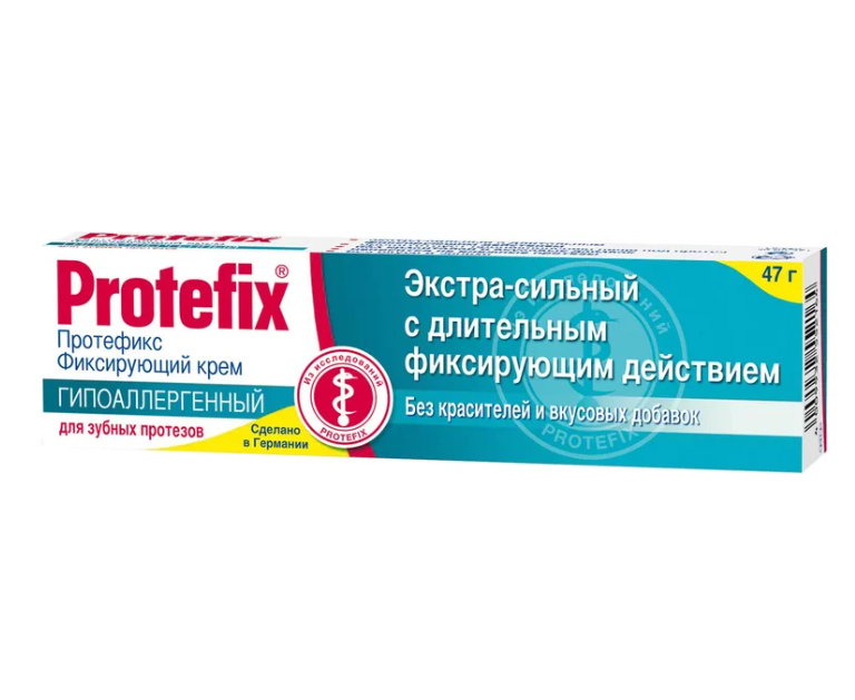 Крем Протефикс предназначен для длительной фиксации протезов – на 12 часов, рекомендуется людям с повышенным слюноотделением, предотвращает попадание пищи под протез.