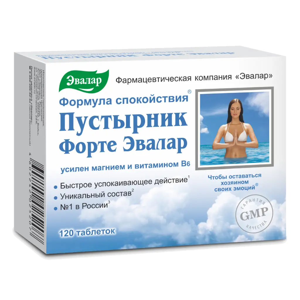 Кроме того, только в Пустырнике Форте Эвалар1 высокая суточная дозировка пустырника (100 мг) усилена «элементами спокойствия» магнием и витамином В6.