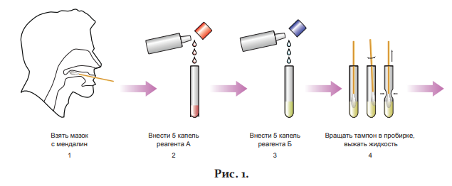 1. С помощью стерильного ватного тампона взять мазок с поверхности миндалин и/ или задней стенки гортани, избегая касания с зубами, деснами, языком и щеками (рис. 1-1).