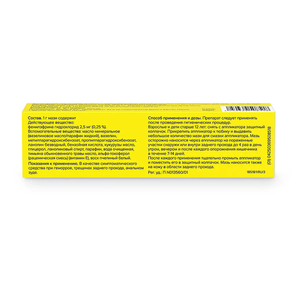 снять с аппликатора защитный колпачок. Прикрепить аппликатор к тюбику и выдавить небольшое количество мази для смазки аппликатора. Мазь осторожно наносится через аппликатор на поражённые участки снаружи или внутри заднего прохода до 4 раз в день утром, вечером и после каждого опорожнения кишечника.