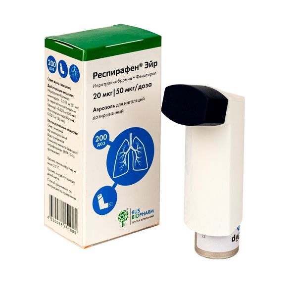 Респирафен® Эйр содержит два компонента, обладающих бронхолитической активностью: ипратропия бромид — М-холиноблокатор и фенотерола — β2-адреномиметик. Бронходилатация при ингаляционном введении ипратропия бромида обусловлена, главным образом, местным, а не системным антихолинергическим действием.